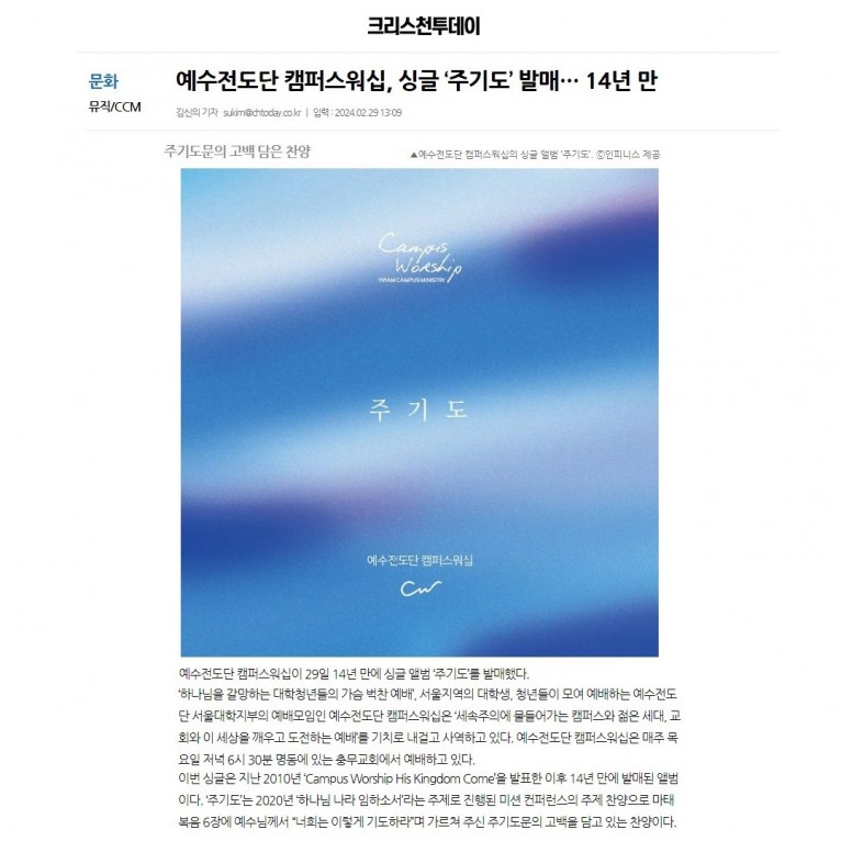 뮤직타임 [기사] 예수전도단 캠퍼스워십, 싱글 ‘주기도’ 발매… 14년 만(크리스천투데이)