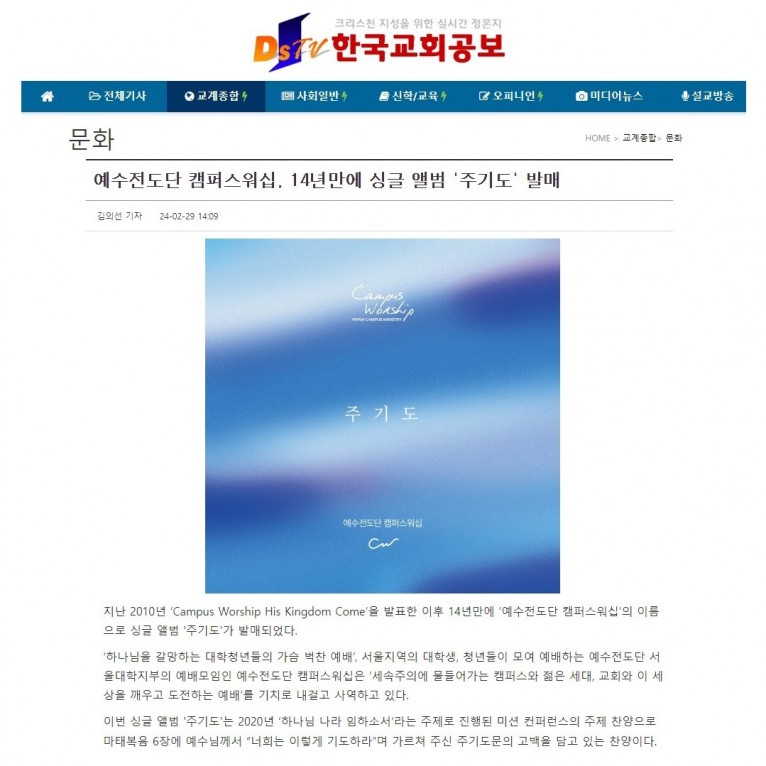 [기사] 예수전도단 캠퍼스워십, 14년만에 싱글 앨범 '주기도' 발매(한국교회공보)