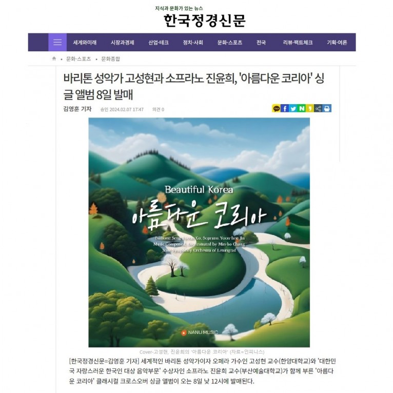 [기사] 바리톤 성악가 고성현과 소프라노 진윤희, '아름다운 코리아' 싱글 앨범 8일 발매(한국정경신문)