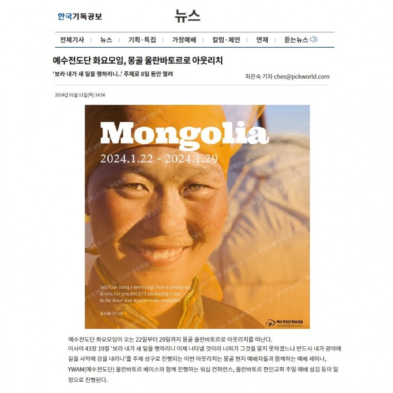 뮤직타임 [기사] 예수전도단 화요모임, 몽골 울란바토르로 아웃리치(한국기독공보)
