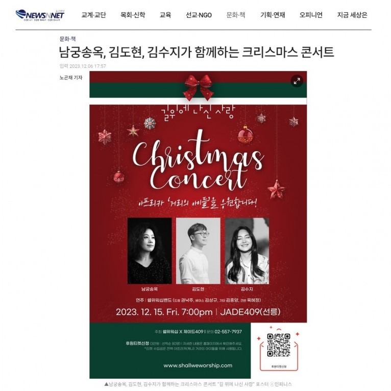 [기사] 남궁송옥, 김도현, 김수지가 함께하는 크리스마스 콘서트(뉴스앤넷)
