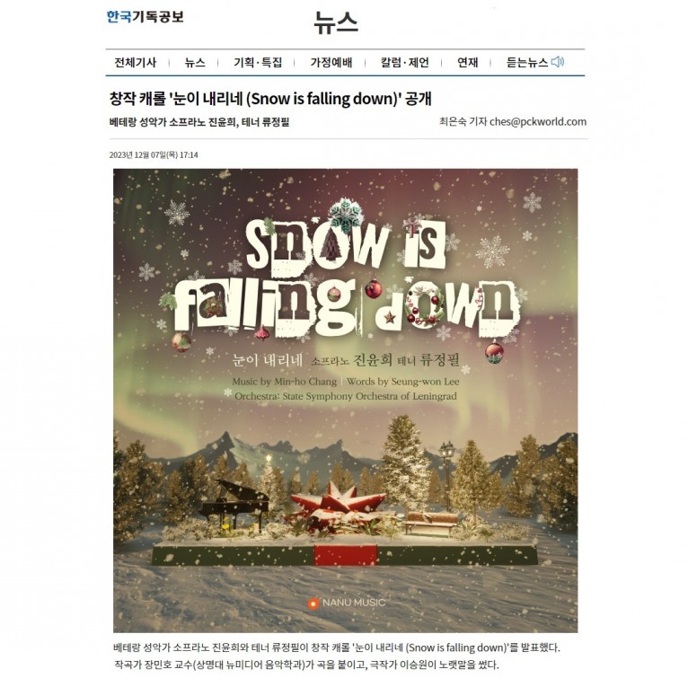 [기사] 베테랑 성악가 소프라노 진윤희, 테너 류정필 창작 캐롤 '눈이 내리네 (Snow is falling down)' 공개(한국기독공보)