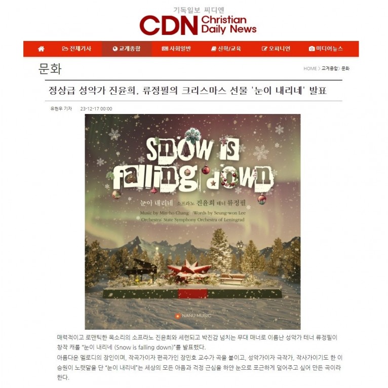 [기사] 정상급 성악가 진윤희, 류정필의 크리스마스 선물 '눈이 내리네' 발표(기독일보 씨디엔)