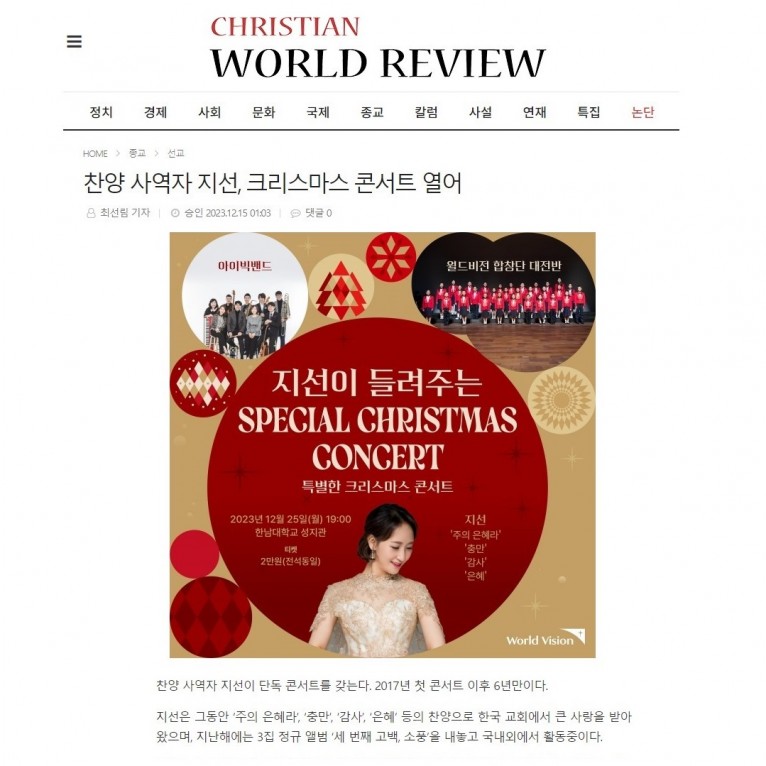 [기사] 찬양 사역자 지선, 크리스마스 콘서트 열어(크리스챤월드리뷰)