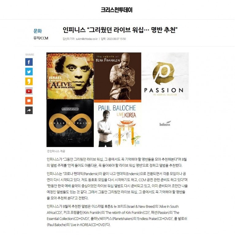 뮤직타임 [기사] “그리웠던 라이브 워십… 명반 추천”(크리스천투데이)