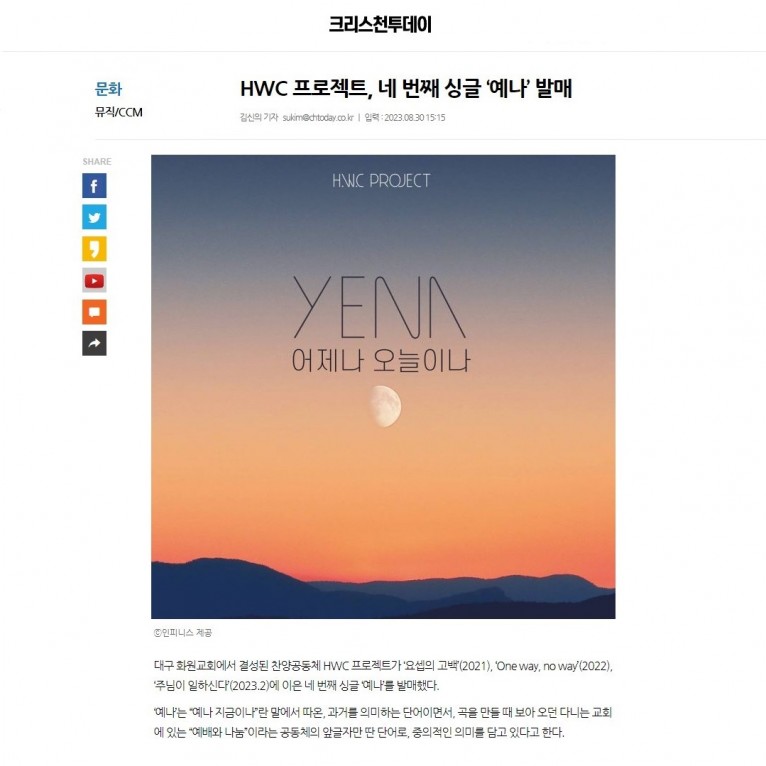 [기사] HWC 프로젝트, 네 번째 싱글 ‘예나’ 발매(크리스천투데이)