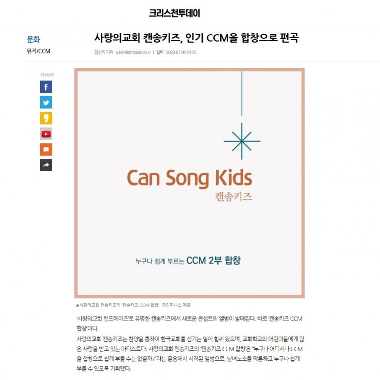 뮤직타임 [기사] 사랑의교회 캔송키즈, 인기 CCM을 합창으로 편곡(크리스천투데이)