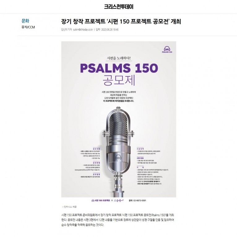 [기사] 장기 창작 프로젝트 ‘시편 150 프로젝트 공모전’ 개최(크리스천투데이)