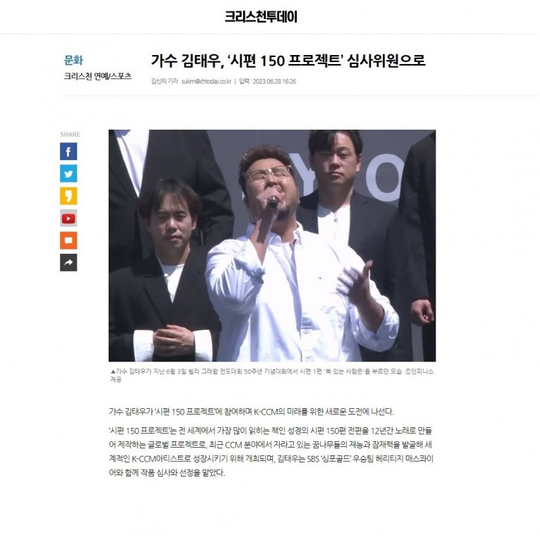 [기사] 가수 김태우, ‘시편 150 프로젝트’ 심사위원으로(크리스천투데이)