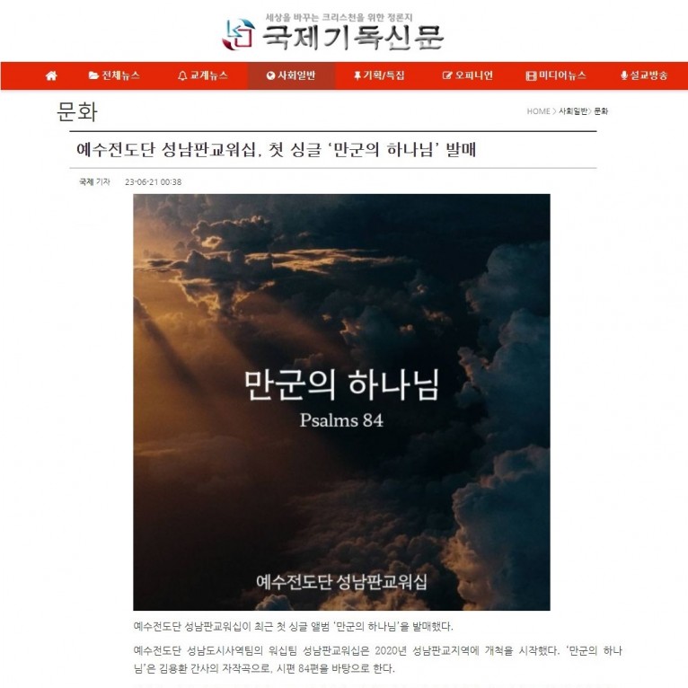 뮤직타임 [기사] 예수전도단 성남판교워십, 첫 싱글 ‘만군의 하나님’ 발매(국제기독신문)