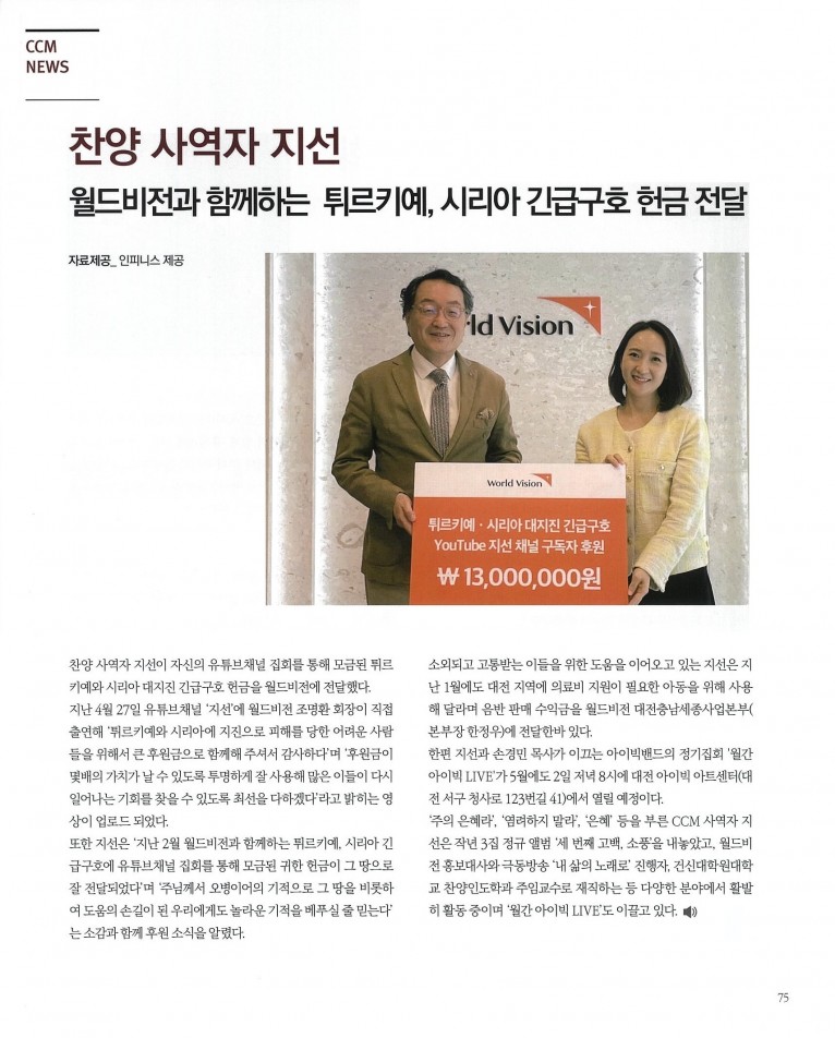 뮤직타임 [잡지] 찬양 사역자 지선, 월드비전과 함께하는 튀르키예, 시리아 긴급구호 헌금 전달(월간 Church Media 5월호)