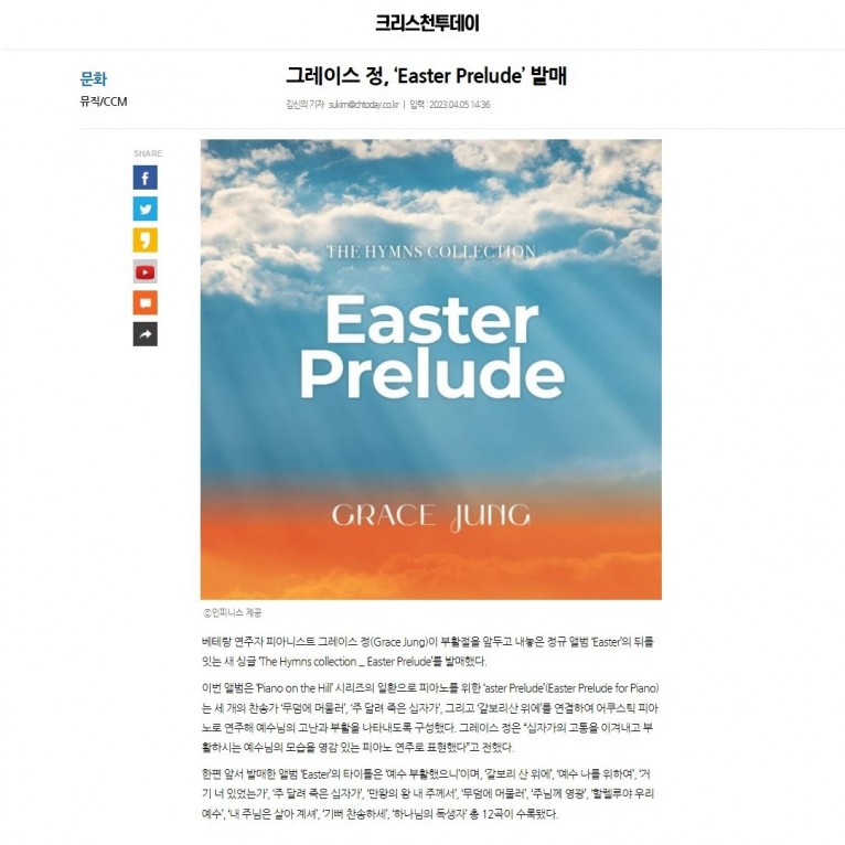 뮤직타임 [기사] 그레이스 정, ‘Easter Prelude’ 발매(크리스천투데이)