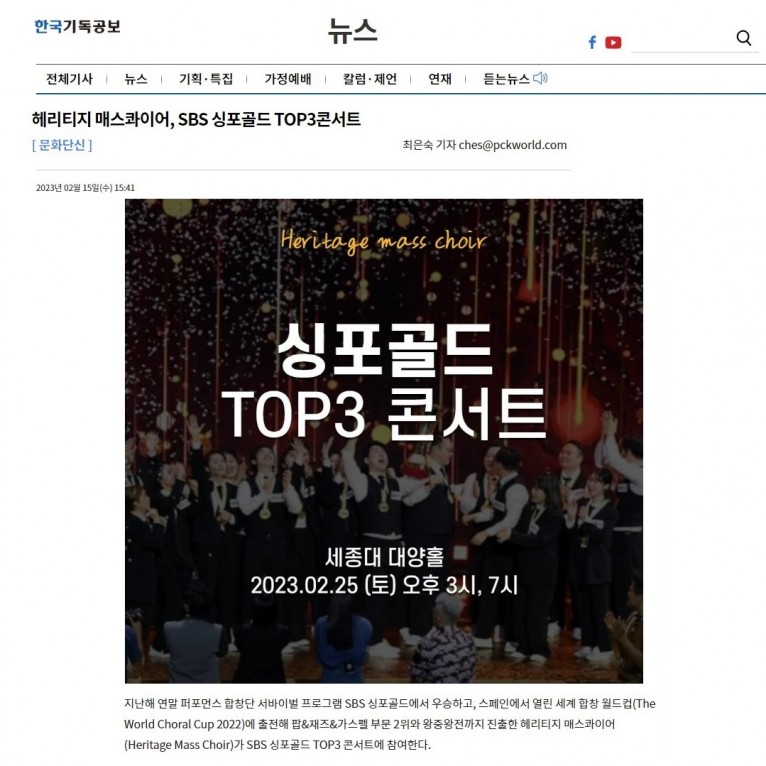[기사] 헤리티지 매스콰이어, SBS 싱포골드 TOP3콘서트