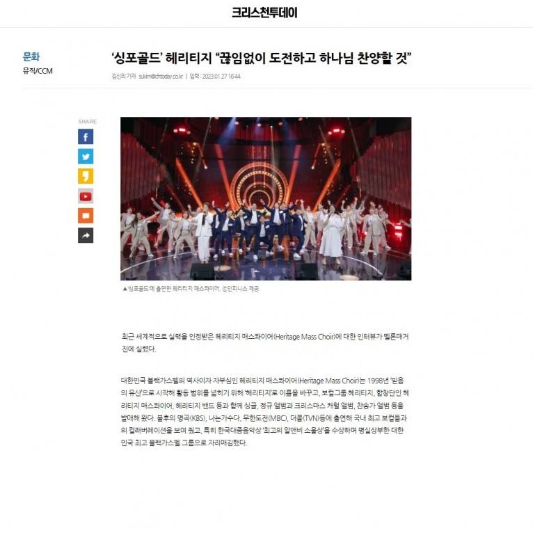 [기사] ‘싱포골드’ 헤리티지 “끊임없이 도전하고 하나님 찬양할 것”