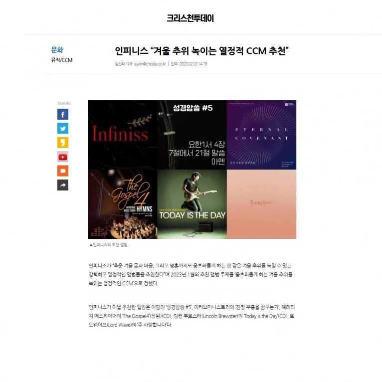 뮤직타임 [기사] 인피니스 “겨울 추위 녹이는 열정적 CCM 추천”(크리스천투데이)