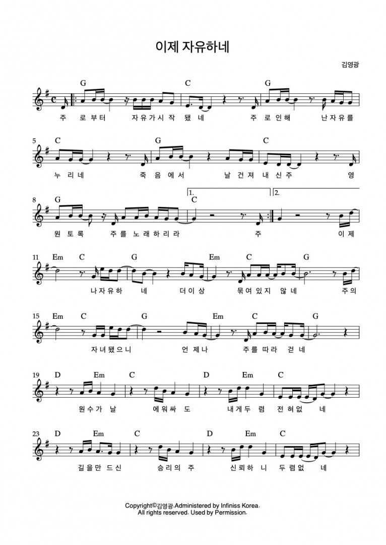 뮤직타임 [악보] 이제 자유하네 - 김영광 (예수의 사랑이) (EP)(음원)