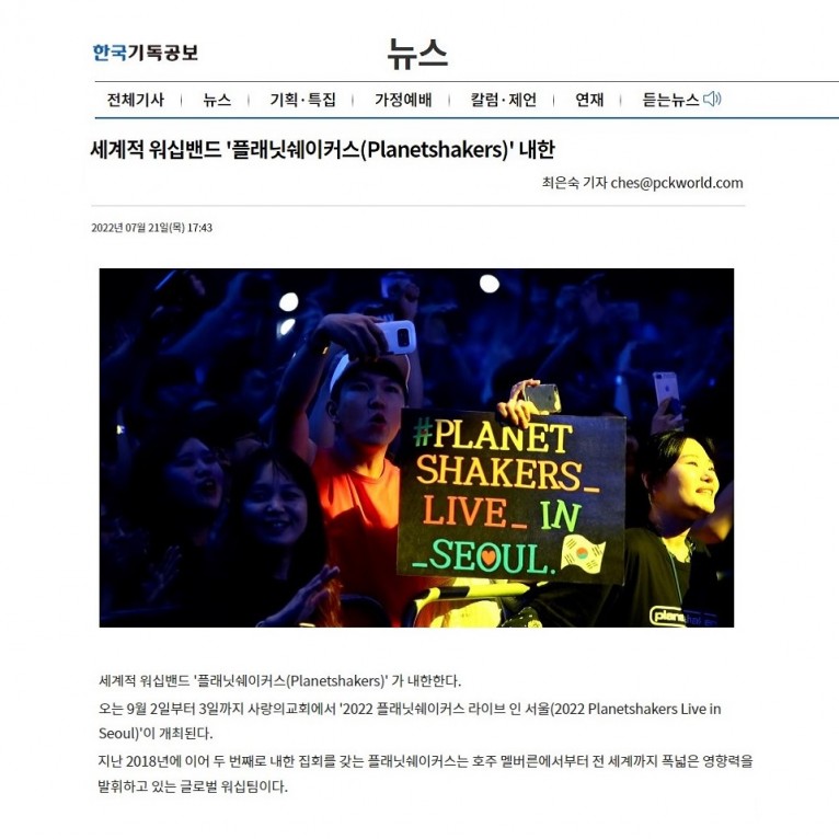 [기사] 세계적 워십밴드 '플래닛쉐이커스(Planetshakers)' 내한