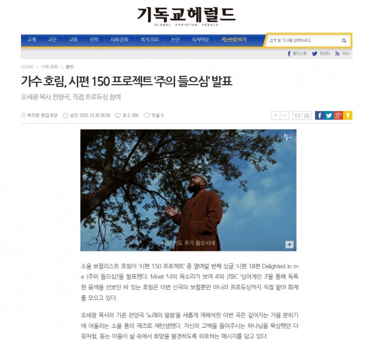 [기사] 가수 호림, 시편 150 프로젝트 ‘주의 들으심’ 발표(기독교헤럴드)