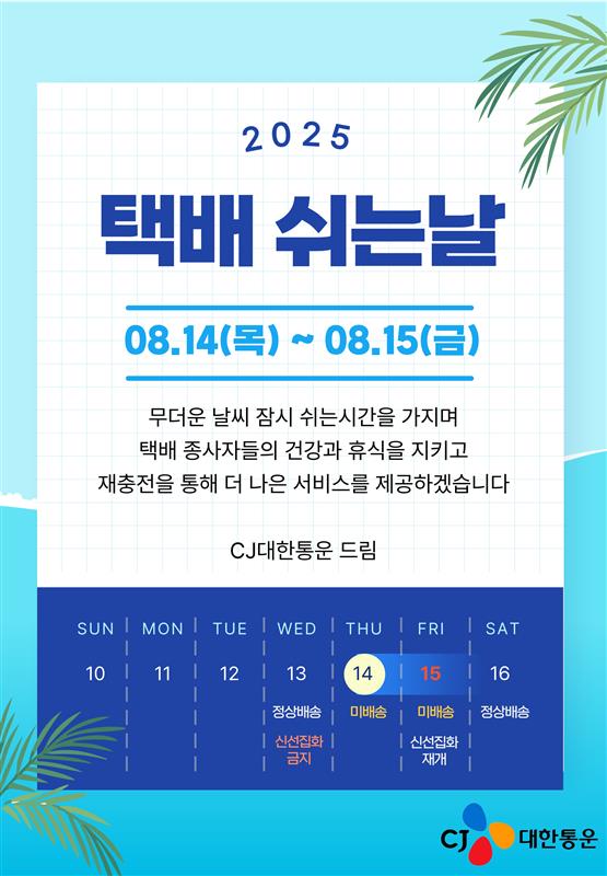 저희가 배송 대행하는 CJ대한통운이 다음과 같이 '택배 쉬는 날' 공지를 해와 안내 드립니다.