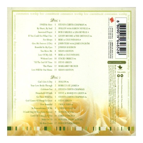 Disc 1 1. I Will Be Here / Steven Curtis Chapman 2.By Heart, By Soul / Avalon 3.Answered Prayer / Bob Cralisle & Lisa Beville 4.If You Could See What I See/ Geoff Moore & The Distance 5. For Always / Bebe & Cece Winans 6. Give Mc Forever(I Do) / John Tesh with James Ingram 7. Beautiful In My Eyes / Joshua Kadison 8. You Move Me / Susan Ashton 9. Love Of My Life / Bebe & CeCe Winans 10. Til The End Of Time / Steve Green 11. This Flame / Margret Beacker 12. Love Will Be Home / Magaret Becker