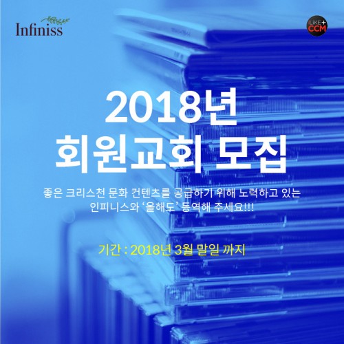 현재 각 교회에서는 좋은 크리스천 문화 컨텐츠를 요구하는 성도들의 요구와 수효가 많아 목회자들과 각 부문 담당자들의 고민이 크실 겁니다. 저희가 도움이 되고자 예배에 직접적으로 사용 가능한 음악 컨텐츠를 정기적으로 공급해 드리는 ‘2018년 회원교회’를 모집합니다.